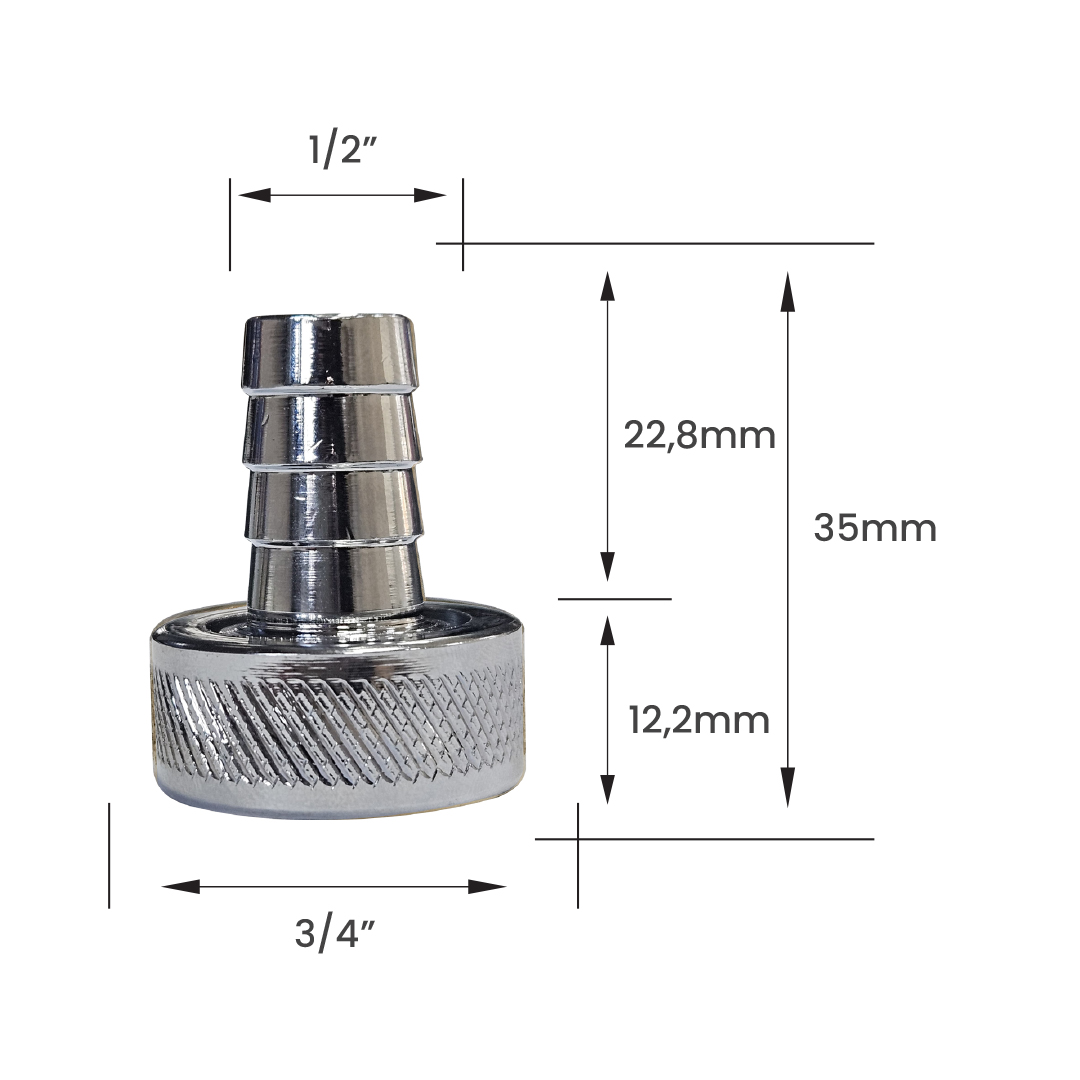 • Código:   11727CRE Rosca:  3/4" Fêmea Espiga:  1/2" Medida:  Para mangueira 1/2" Tipo:  - Acabamento:  Latão Cromado
